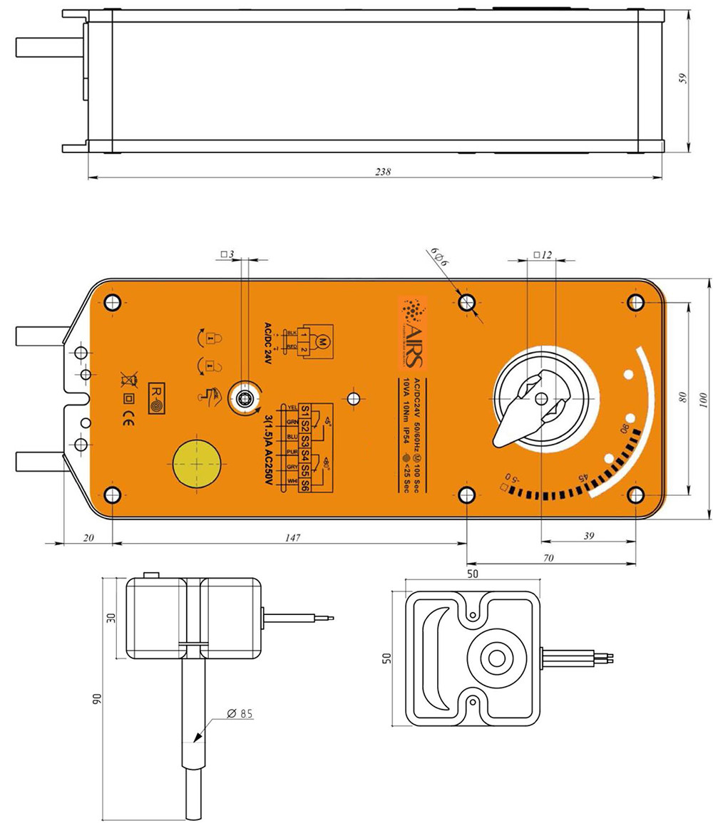 Электропривод устанавливается на клапан с квадратным приводным валом размером 12 мм и закрепляется через крепежные отверстия ø 6 мм к корпусу клапана