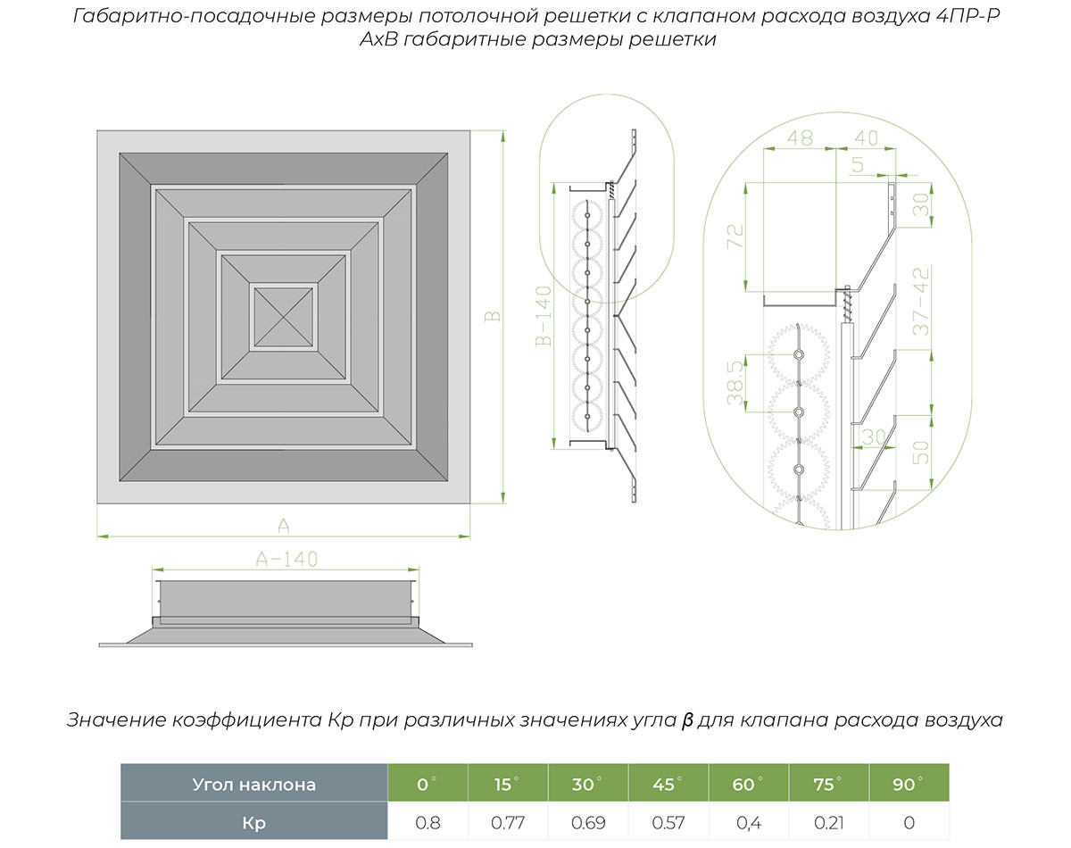 Потолочная решетка 4ПР-Р предназначена для распределения воздушного потока внутри помещения в четыре стороны и регулирования объема поступающего в помещение воздуха. Следуя из названия потолочные решетки устанавливаются в основном в потолок, как правило, типа Армстронг, размеры решетки соответствуют размеру потолочной ячейки.