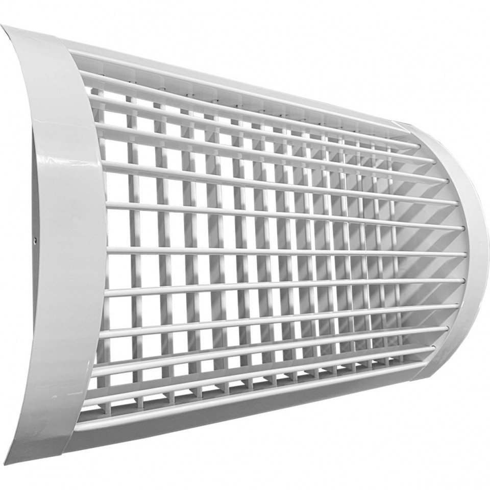 КРВ представляет собой рамку с установленными в неё лопатками. Положение лопаток регулируется при помощи ручки. Изменение положения лопаток позволяет изменять площадь свободного сечения решетки, тем самым регулируя объем подаваемого воздуха. Заказать двухрядную цилиндрическую решетку РАД-Ц+Р.