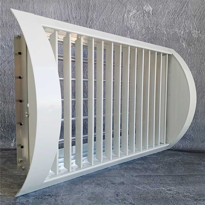 Рамка решетки имеет цилиндрическую форму повторяя круглую форму воздуховода, при этом посадочная часть имеет прямоугольную форму под размер строительного проема. В рамку устанавливаются вертикальные каплеобразные жалюзи, угол наклона которых регулируются независимо друг от друга для изменения направления воздуха.