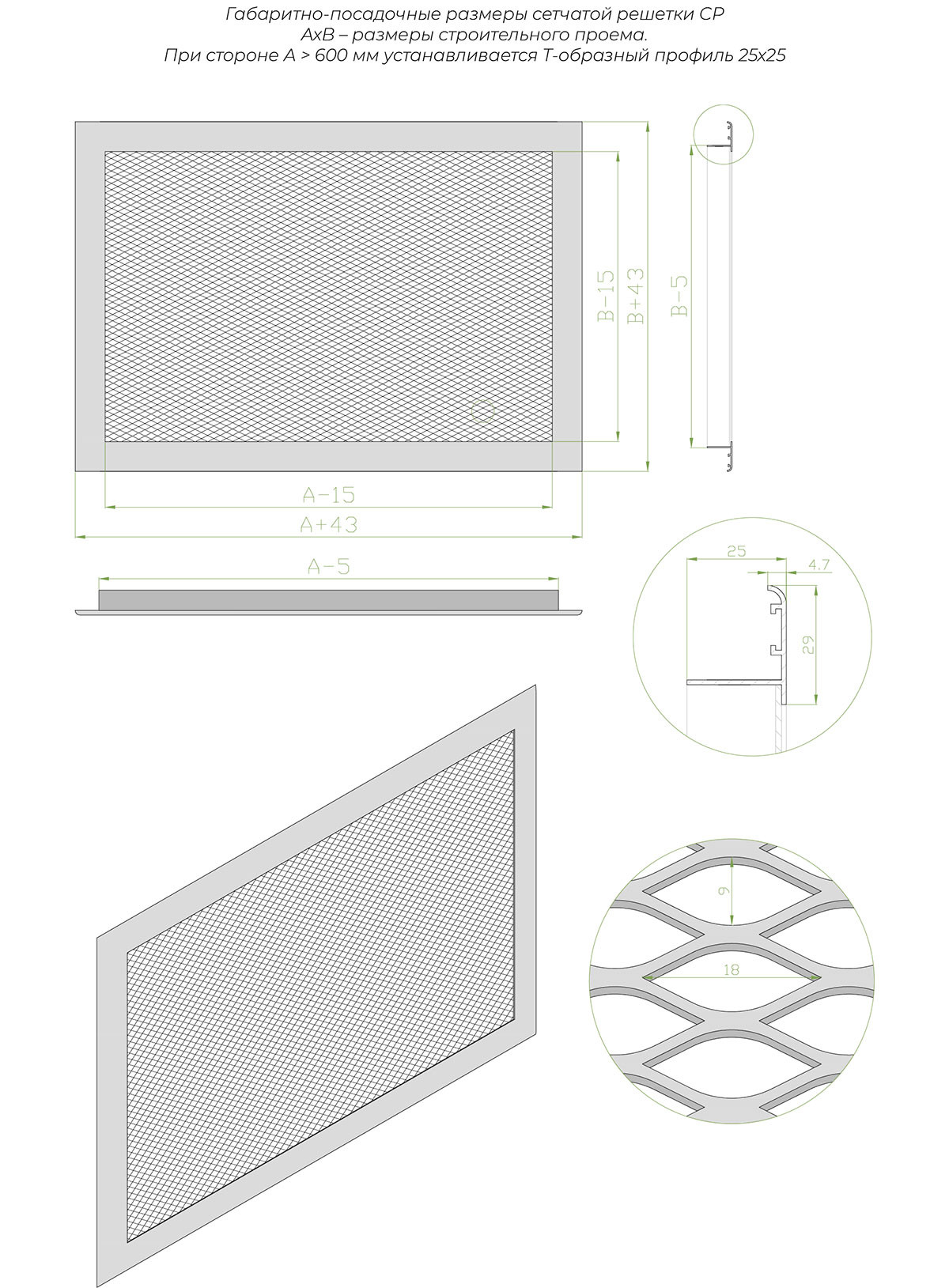 Решетки СР представляют собой рамку с закрепленной в нее стальной сеткой с помощью вытяжных заклепок. По умолчанию устанавливается просечно-вытяжная сетка 18х9 мм, по запросу возможно изготовление решеток с сеткой 10х10 мм.